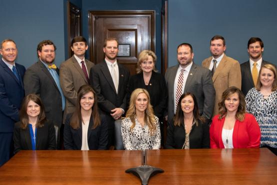 Senator Hyde-Smith meets with a Mississippi Young Farmers and Ranchers delegation: (seated, from left): Ashley Rambo of Iverness, Kelli Russell of Pheba, Brittany Rodgers of Belzoni, Cala Tabb of Eupora, Kayla Poe of Pontotoc, and (standing) Billy Tabb of Eupora, Walt Rambo of Iverness, David Rus