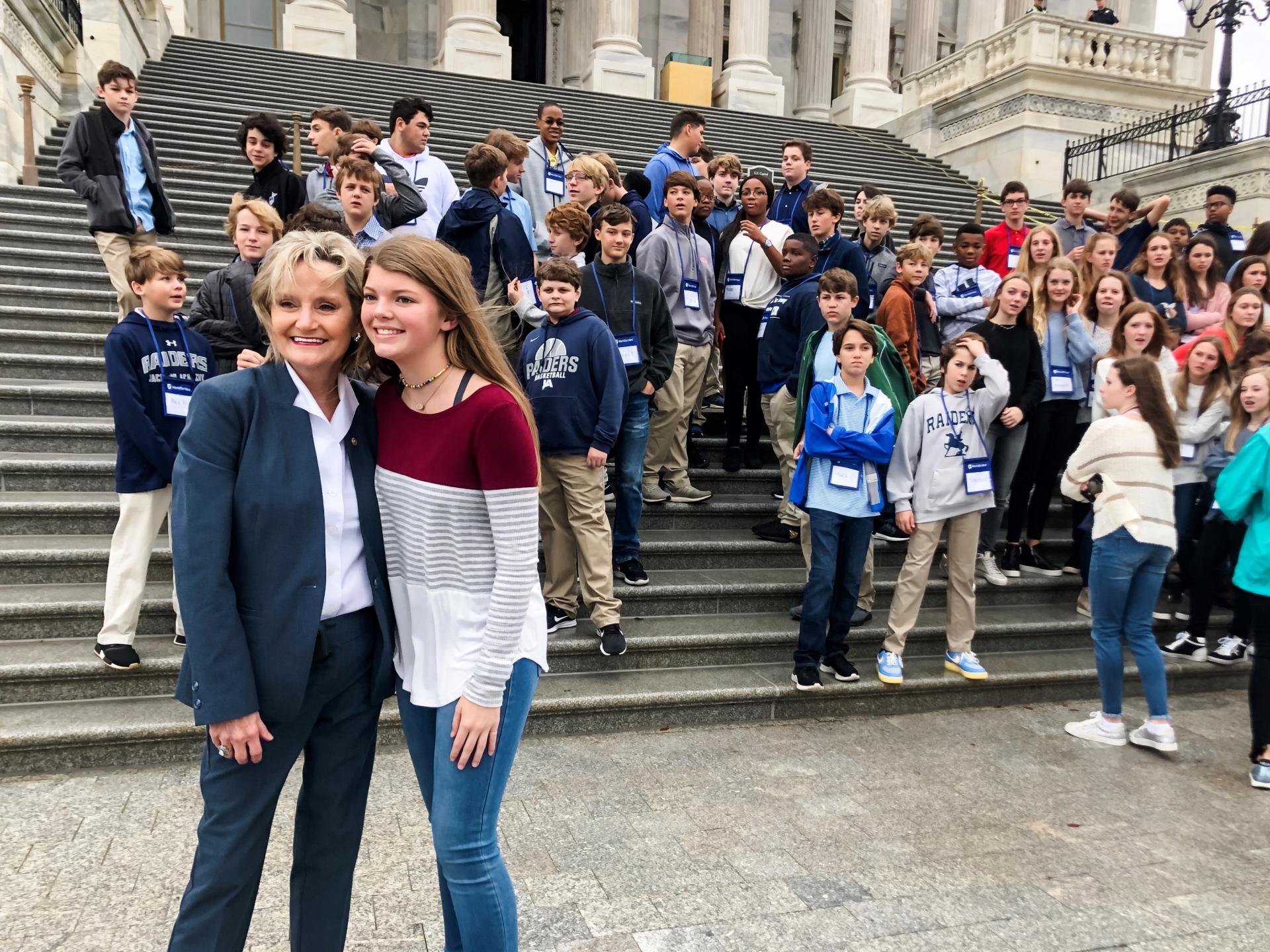 Senator Hyde-Smith greets 8th grade students from Jackson Academy on the Capitol Steps. (Oct. 31, 2019) Category Students Visits Previous Next